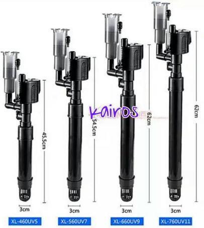 Pompă de apă cu powerhead XiLong cu sterilizator UV, filtru de suprafață pentru apă (skimmer) și duză dublă. Pompa de apă poate fi montată la cerere, fără sterilizatorul UV, funcționează ca un cap de putere convențional. Sterilizatorul UV este o modalitate eficientă de a elimina creșterea algelor. Skimmerul îndepărtează straturile de peliculă de la suprafața apei. Apa poate fi deviată către un alt punct din acvariu sau către un filtru de curgere personalizat cu ajutorul unui tub de transmisie conectat la duza superioară.
